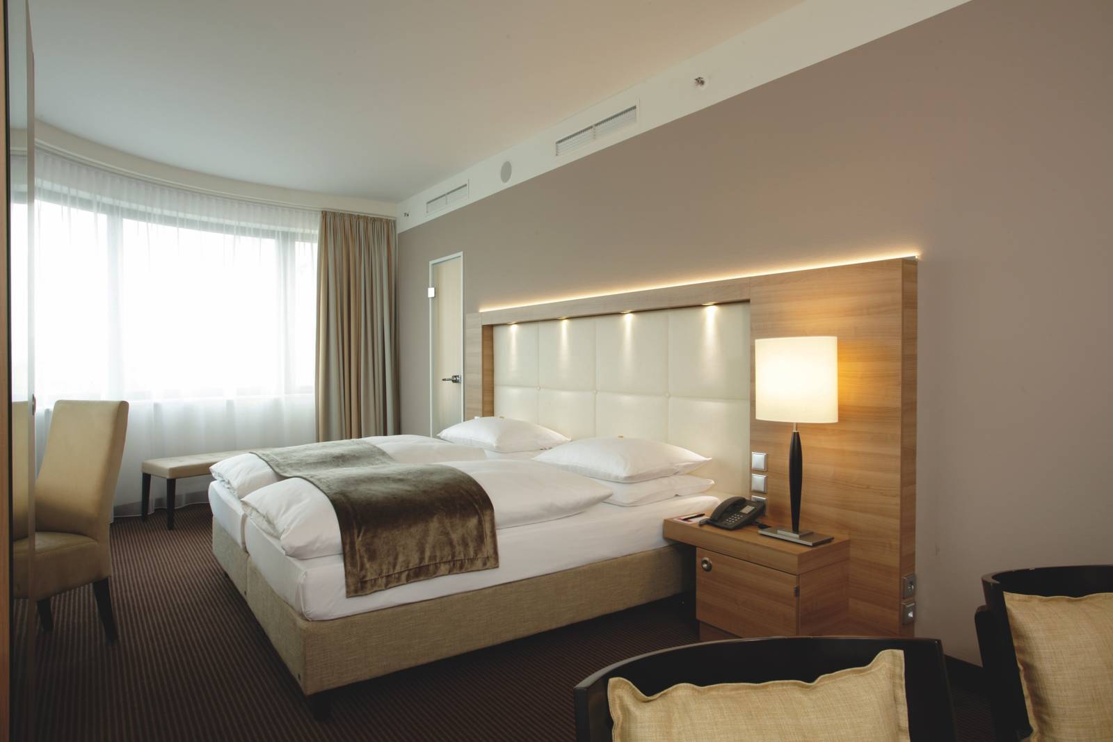 Dispone di camere doppie e singole da 20mq dotate di impianto di climatizzazione, cassetta di sicurezza, minibar, tv schermo piatto, accesso wifi, bollitore te e caffè, bagno con doccia, riscaldamento a pavimento, asciugacapelli, kit di cortesia.